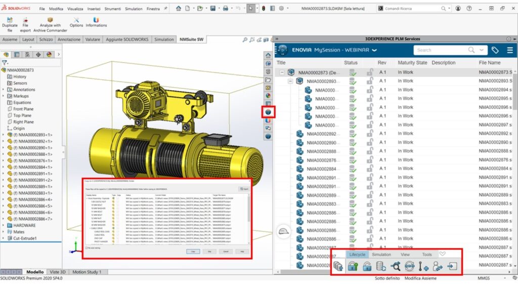 Questo connettore ci permette di gestisce automaticamente i file CAD e di simulazione, attraverso un processo di revisione mediante l’app Collaborative Lifecycle, che vediamo nell’immagine in basso a destra.