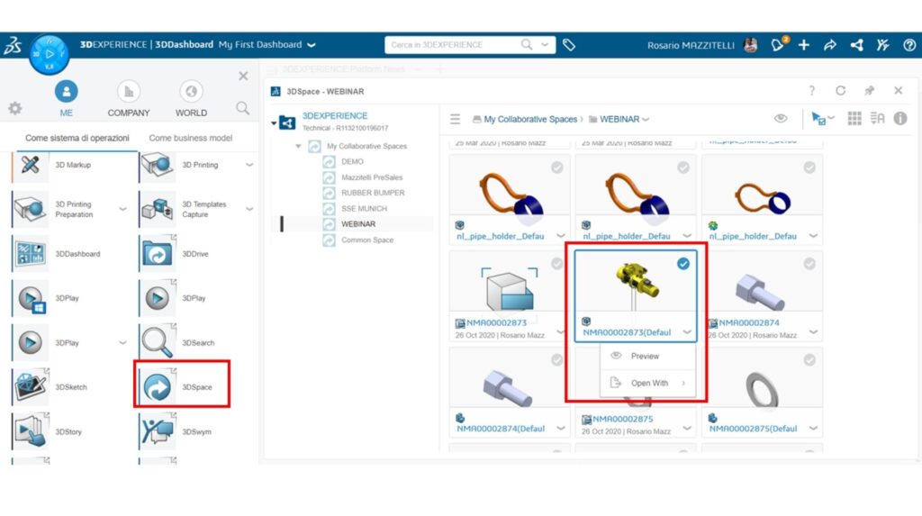 Una volta trasferiti i files dal nostro pc alla piattaforma 3DEXPERIENCE, questi files verranno archiviati e recuperati dall’applicazione 3DSpace, che altro non è una cartella di lavoro sul cloud.