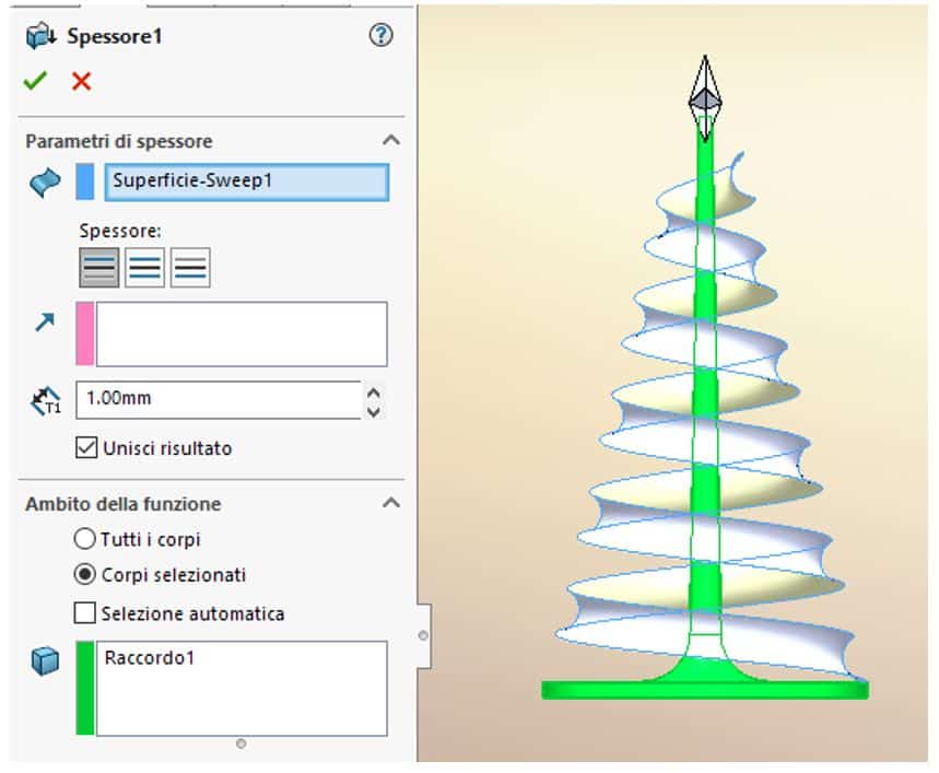 Per rendere solido il corpo di superficie appena modellato, dovrai aggiungergli uno spessore. Seleziona la funzione Ispessimento nel menu “Inserisci”->”Estrusione/Base”->”Ispessimento” ed imposta uno spessore di 1 mm per la superficie realizzata al punto 6.
