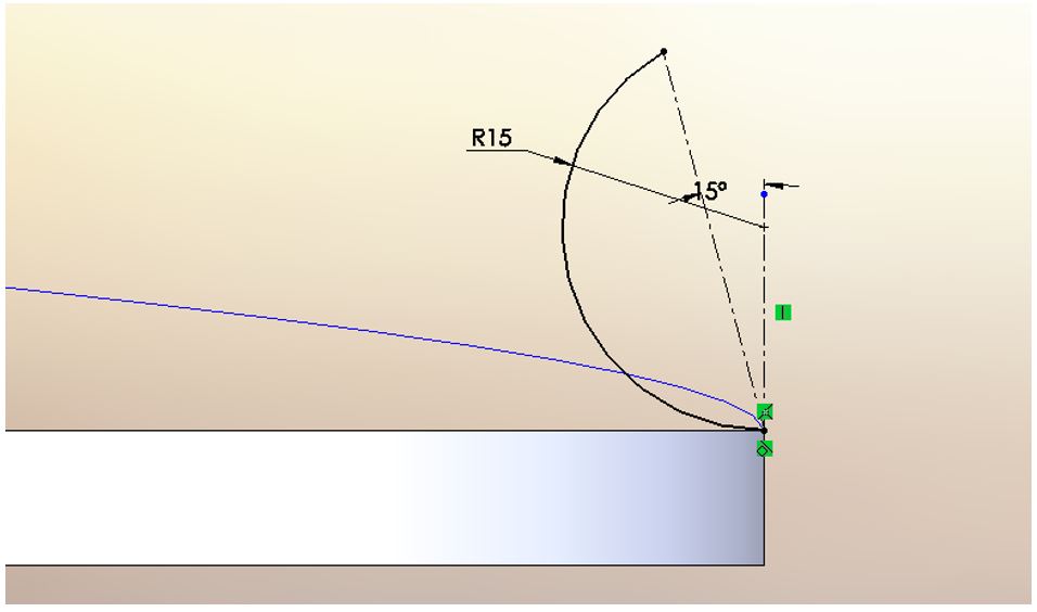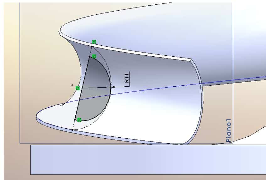Crea un nuovo schizzo sul piano destro e posizionati all’inizio della curva. Disegna e vincola lo schizzo come indicato in figura.