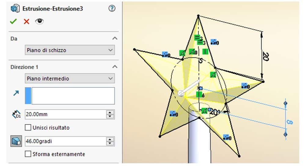La forma della stella può sembrare difficile da realizzare, in realtà è sufficiente creare uno schizzo sul piano frontale (vedi figura). Ti consiglio di creare la prima punta e di usare la ripetizione circolare di schizzo per creare velocemente le altre 4 punte. Una volta vincolato lo schizzo, dovrai estruderlo a piano intermedio per 20 mm, aggiungendo uno sformo di 46° per dargli la classica forma a punta, tipica di una stella.