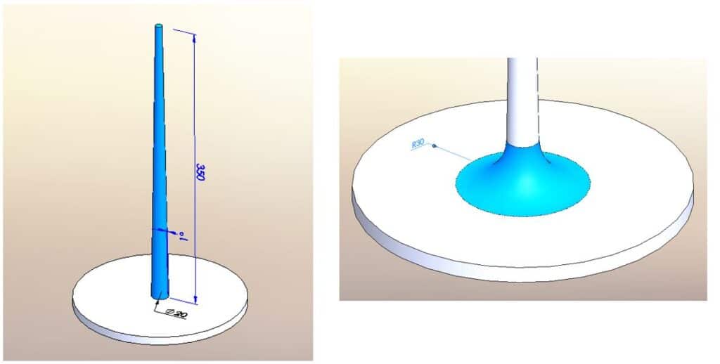 Per realizzare il tronco ti servirà uno schizzo circolare del diametro di 20 mm sulla faccia dell’estrusione di base. Vincolato lo schizzo, potrai estruderlo per 350mm con sformo di 1°. Aggiungi poi un raccordo di 30mm sul bordo della base del tronco appena realizzata.