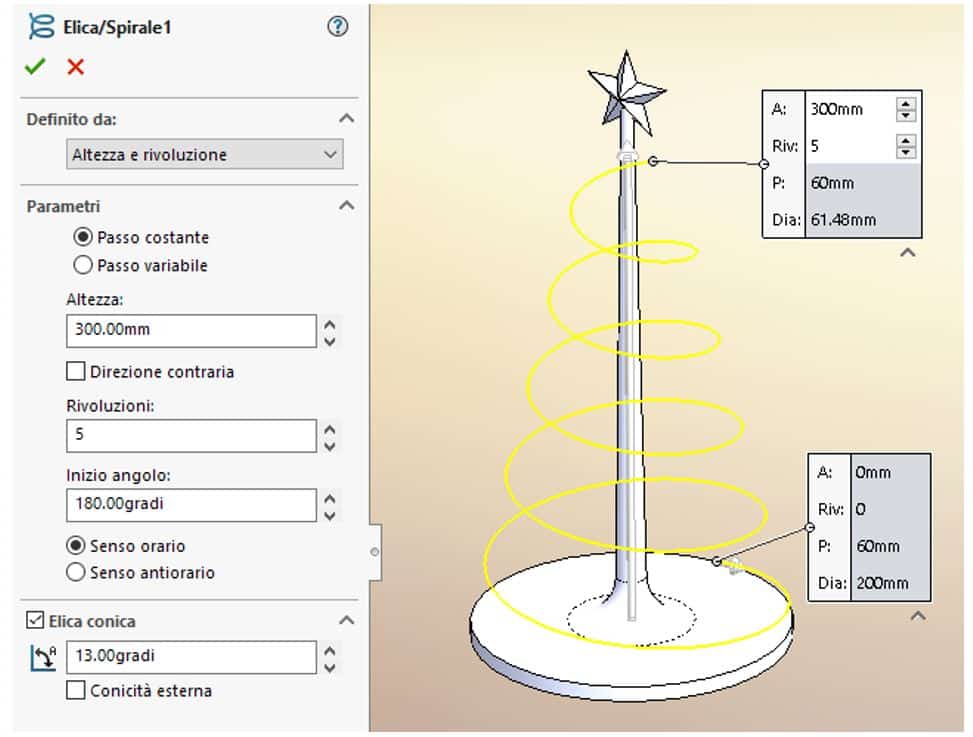 Per disegnare una curva elicoidale, serve una circonferenza di base. Per ottenerla velocemente, puoi creare uno schizzo sulla base e convertire in entità di schizzo il bordo esterno della base. Fatto ciò, puoi procedere col comando “elica e spirale” per definire i parametri dell’elica conica che ti occorre (vedi figura).