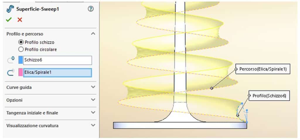 Per creare una sweep di superficie occorrono un profilo ed un percorso. Utilizza come profilo lo schizzo realizzato al punto 5 e come curva l’elica realizzata al punto 4.