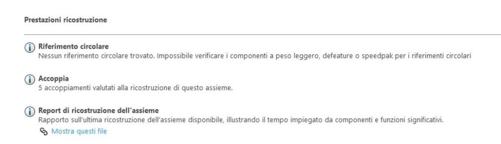 Riassume il tempo di ricostruzione totale dell’Assieme, dei suoi accoppiamenti e delle parti che lo compongono, fornisce indicazioni sulle prestazioni delle parti con relazioni nel contesto ed eventuali conflitti ed evidenzia la presenza di eventuali riferimenti circolari (il male peggiore per il decadimento delle prestazioni).