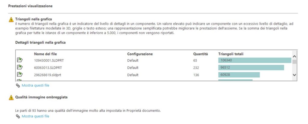 Questo tool ti permette di analizzare le prestazioni di un assieme e ti suggerisce eventuali azioni per migliorarle. Prima di attivarlo, per avere tutti i dati di ricostruzione aggiornati ed attendibili, ricorda di ricostruire completamente l’assieme usando il comando CTRL+Q, non il semaforo. Attenzione al fatto che questo tool produce solo un report, per cui non significa che i warning in esso contenuti siano necessariamente degli errori da correggere. Modificare l’assieme seguendo le indicazioni, significa ottenere performance migliori, col rischio però di compromettere la finalità progettuale.