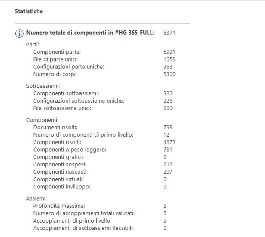 Riporta una serie di dati statistici relativi all’assieme, come ad esempio il numero totale dei componenti (parti e sottoassiemi), il loro stato, il numero di accoppiamenti, la profondità massima della gerarchia dell’assieme (per i sottoassiemi annidati), il numero dei componenti di primo livello, il numero dei componenti risolti, a peso leggero e sospesi, etc…