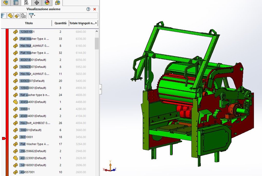 Visualizzazione dell’assieme è uno strumento di valutazione degli assiemi che consente di visualizzare ed ordinare i componenti dell’assieme in un elenco classificato per colore direttamente nell’area grafica. L’elenco può essere ordinato per proprietà, siano esse proprietà di sistema, come ad esempio massa, volume, quantità, etc, oppure proprietà personalizzate dell’utente, fino ad arrivare a definire anche criteri complessi creando equazioni tra proprietà diverse. Una volta definito il criterio di ordinamento, il software applica i colori ai componenti in base al valore della proprietà scelta come riferimento. Tra le proprietà a disposizione ci sono anche il numero di triangoli delle parti, i tempi di apertura e i tempi di ricostruzione: settandoli opportunamente puoi ottenere un report grafico delle prestazioni dell’assieme, i cui colori evidenziano direttamente nell’area grafica i componenti più problematici.