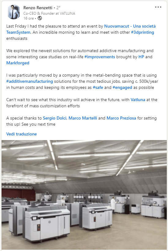 I 3DPrinting Days sono l’esclusivo format interattivo sul mondo della stampa 3D ideato da Nuovamacut. Impara con i migliori esperti italiani di stampa 3D e rendi la tua azienda davvero competitiva grazie ai consigli personalizzati del nostro team di consulenti certificati in ambito Additive Manufacturing.